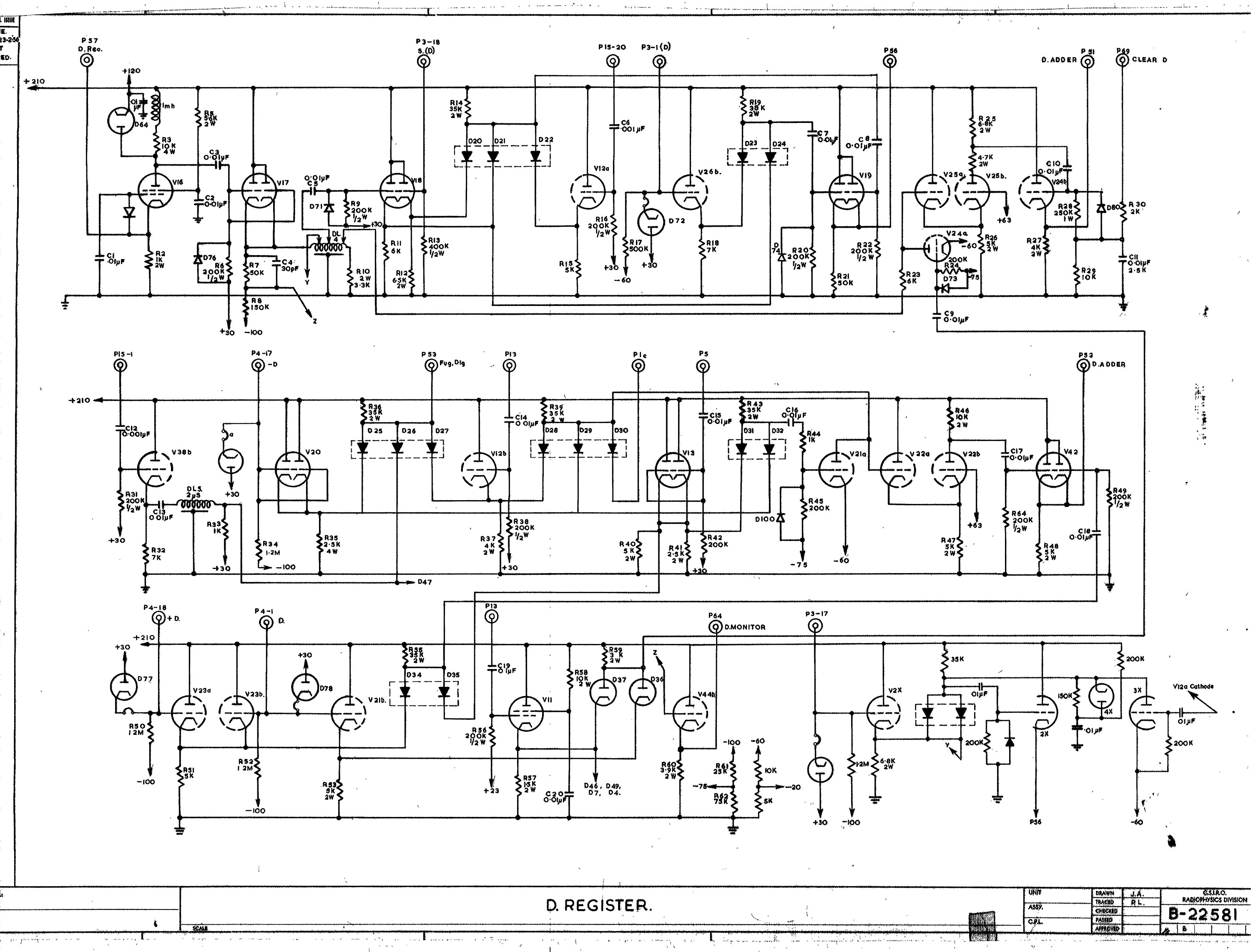 A schematic diagram shows the detailed connections between all the components in a circuit. Such diagrams were used to build circuits and later for testing. For CSIRAC, the most common components were vacuum tubes (valves), capacitors and resistors. Schematic diagrams are also known as circuit diagrams.