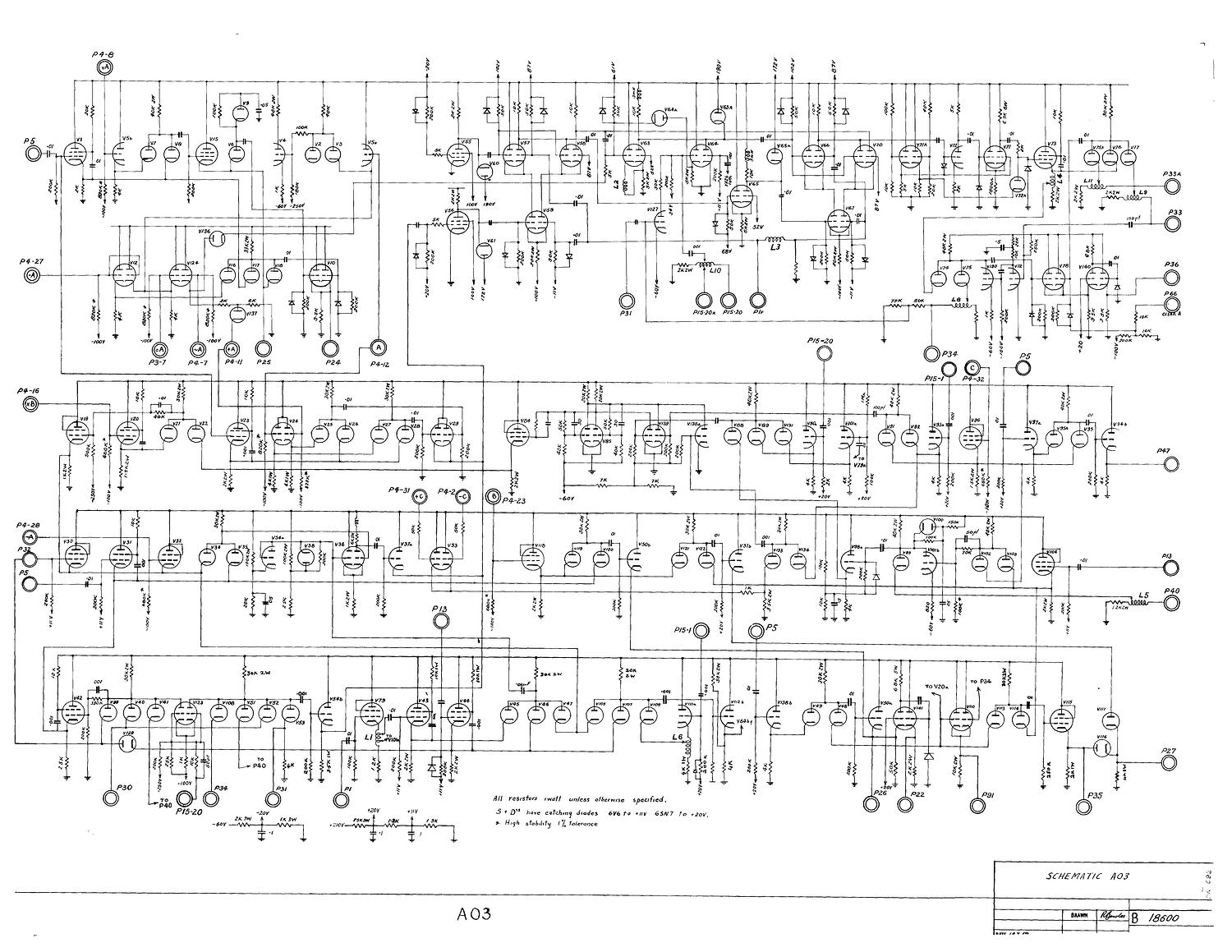 A schematic diagram shows the detailed connections between all the components in a circuit. Such diagrams were used to build circuits and later for testing. For CSIRAC, the most common components were vacuum tubes (valves), capacitors and resistors. Schematic diagrams are also known as circuit diagrams.