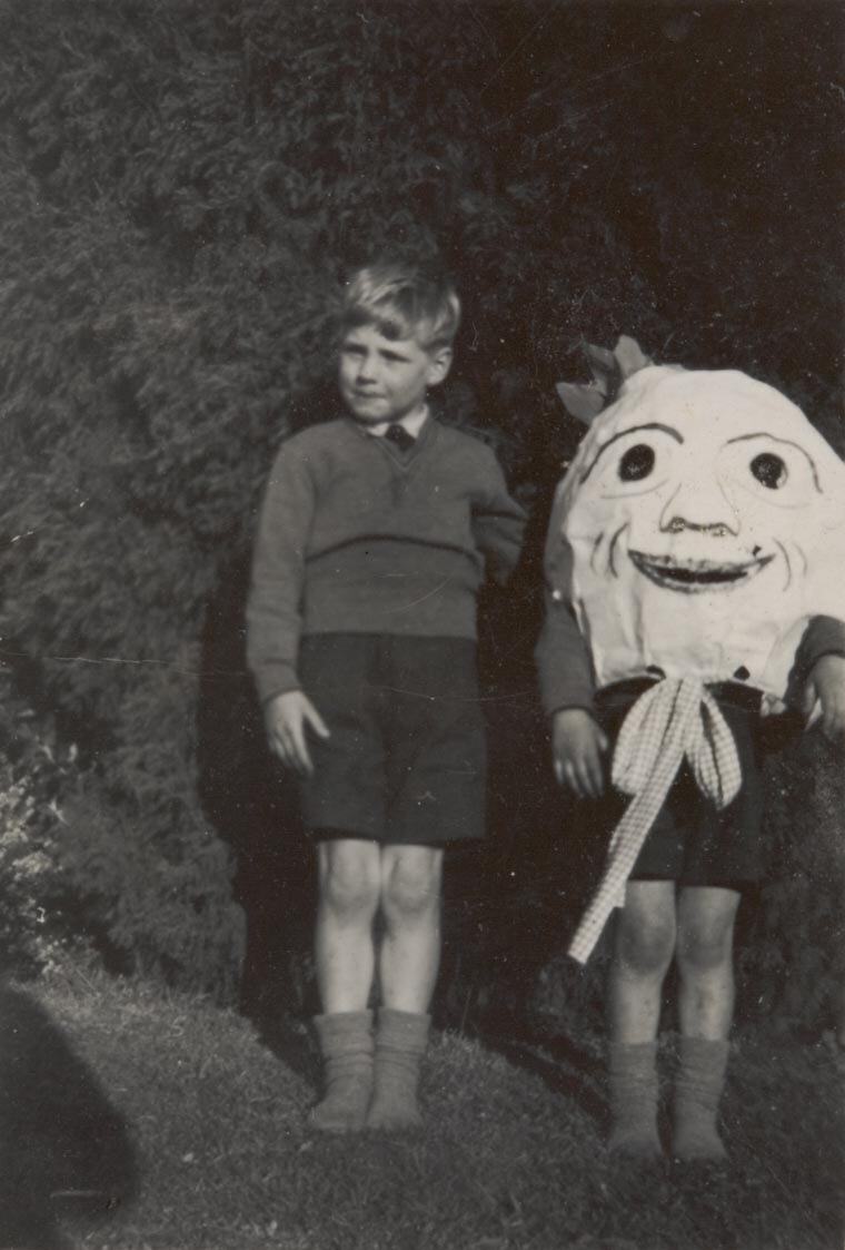 A boy in a papier mache Humpty Dumpty costume, standing next to another little boy. This photograph shows Robert Mierisch, dressed as Humpty Dumpty for the local fete in Kew in 1954, wearing the costume his father Charles made for an East Kew Sunday school concert. The costume had a steel frame and crepe paper covering. Robert stood in the rain outside the fete to encourage visitors. At the end of the day a neighbour refused to drive Robert home with the wet costume so it was left at the fete. The costume was left out in the rain and was ruined.