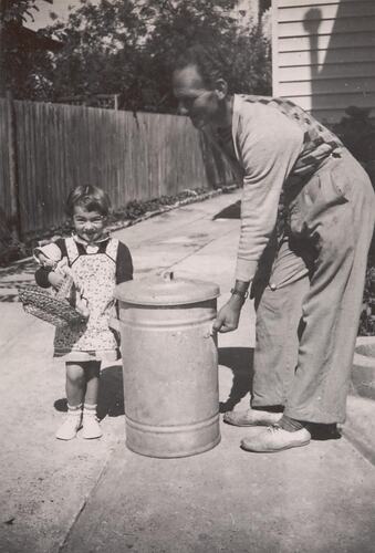 A little girl and a man with a dust bin on the driveway of their house. The little girl is carrying a basket.