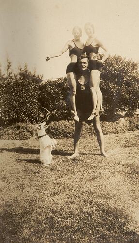 A man balances two girls in cutaway swimming costumes on his hands in a backyard in the early 1930s. A white dog 'begs' in the foreground. The balancing girls were the Fallow twins who were friends of the photographer, Margaret 'Peg' Newing. The man's name is unknown.