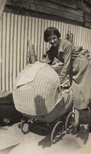 Woman bending over a woven cane pram. Doris Frude with her daughter Helen in a woven cane pram, in St Kilda, late 1930s.