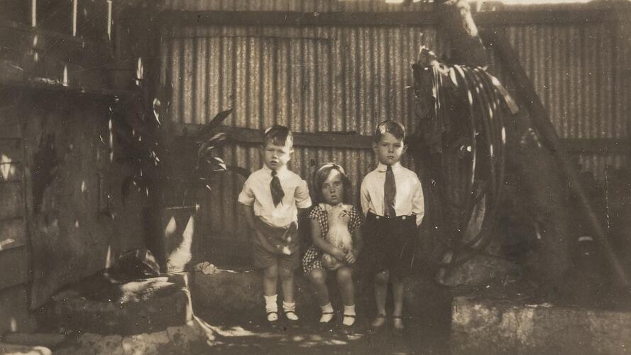 Two young boys and a girl holding a toy cat, in a backyard. Three young children posing in the backyard of the family home in South Melbourne, mid 1930s. Agnes Starkey always had her box brownie handy and was a keen 'shutterbug'.