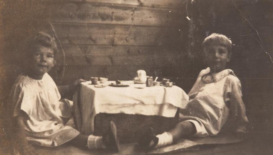 Two children sitting on the floor at a small table, with toy 'tea set'. Kathleen Gawler and her older brother Alan having a tea party at Hawthorn, 1925.