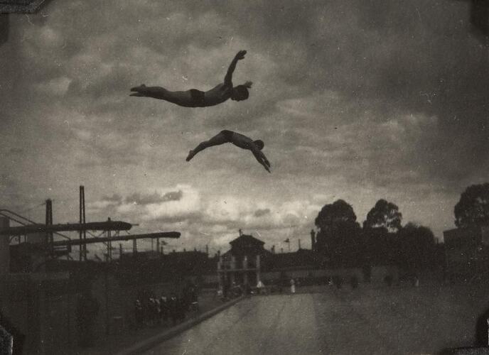 Black and white photograph showing boys practicing diving at the Olympic pool in Richmond, Melbourne in 1939.