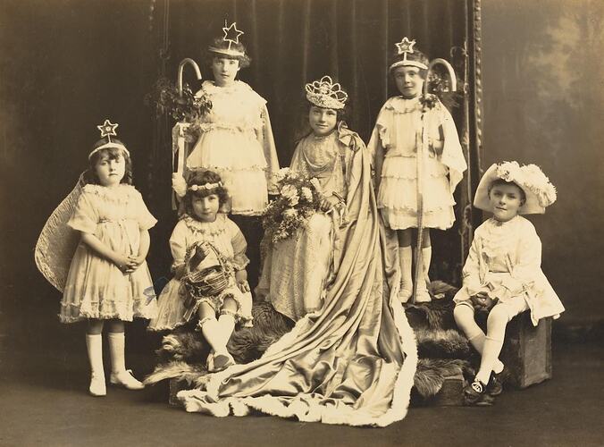 A group of children in 'pageant' dress, posed for a studio picture. This photograph was taken to celebrate a Queen's Parade at St Andrew's School Werribee, about 1924. According to the family, Queen's Parades were a typical kind of primary school festival in the early 1900's, usually held at the end of the school year to give the children something to look forward to. The photographer, Alice Mills, was a well-known Melbourne professional photographer of the early 1900's who specialised in photographs of women and children. Lex Dunlop is seated to the right. The photograph was found by the family in Lex's belongings after his death.
