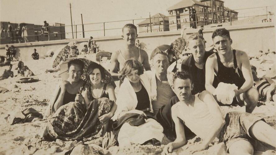 Group of people sitting on beach, near seawall, with buildings behind. Man & woman on left side, carrying parasol with a towel over their knees. Frank and Molly Kennedy with their friends on St Kilda beach in the mid 1930s.