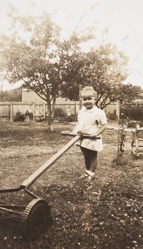 Black and white photograph showing Faye Irvine aged two and a half years old at her home in Preston East, 1944-1945. Her father was away fighting in World War II, serving in New Guinea in the RAAF and she was keen to help do his chores for him. Here she attempts to mow the lawn in the backyard of her family home.