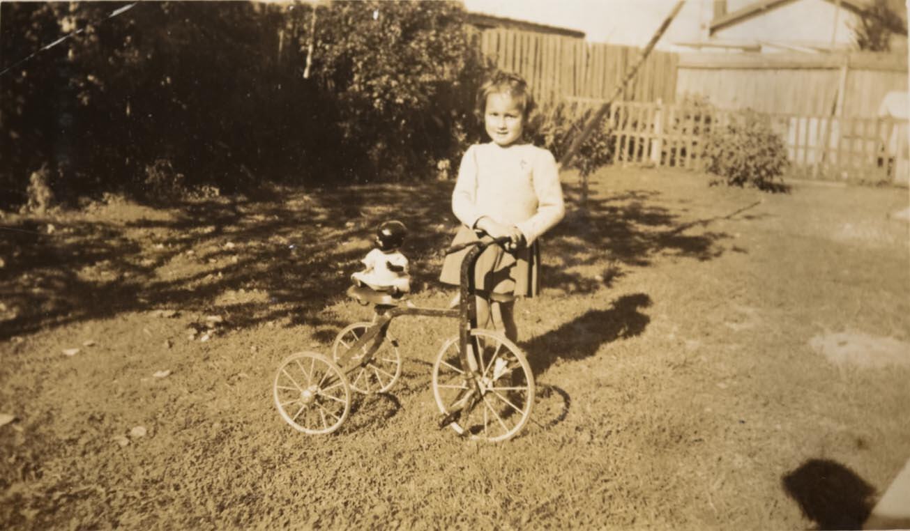 Girl standing with her tricycle and 'black' doll, in backyard. Faye Irvine at her home, Preston East, 1947. The tricycle was Faye's birthday present from her parents and here she is giving her favourite doll Topsy a ride.