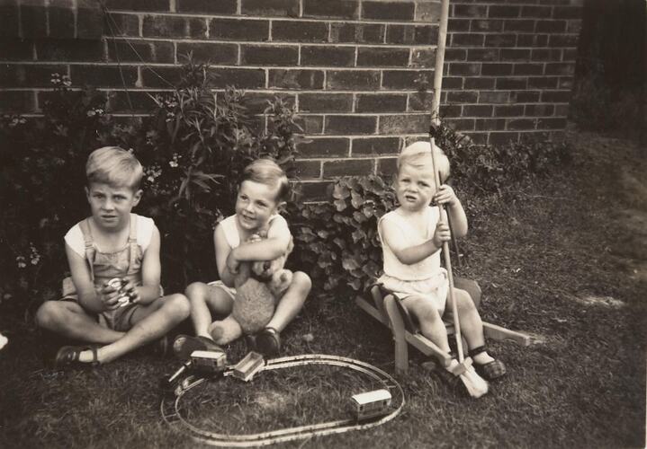 Three boys playing with a toy train set, teddy bear and other toys on the lawn of a backyard. Three brothers Darryl, John and Trevor Hawksworth, in the backyard of the Hawksworth family home, Strathmore, 1949.