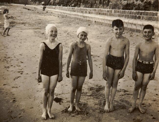 Two girls and two boys in swimming costumes, standing on the beach. The girls are wearing bathing caps. These children, Margaret O'Connell, Joan, Keith and Carl Staindl, are playing in front of the sea wall at Black Rock Beach, 1941. The children all lived in the area.