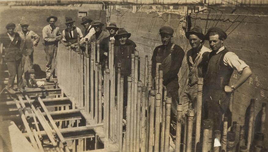 Black and white photograph featuring a group of eleven men, including John Bray, who was a builder, working on construction of the new Royal Melbourne Hospital in Parkville around the late 1930s.