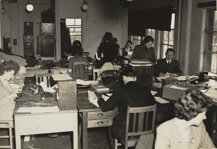 View of a busy office, with men and women at work, Melbourne 1942. A woman is typing on left hand side and another woman is looking at camera, top right corner. Hazel Hall was working as a clerk for the 'Netherlands Indies Government Information Service'. According to her family, she used to walk the cash to the bank with a gun. In this image the 16 year old Hazel is the only one looking at the camera, in the top right corner. The office was on the 10th floor at 400 Collins Street, Temple Court, Melbourne.