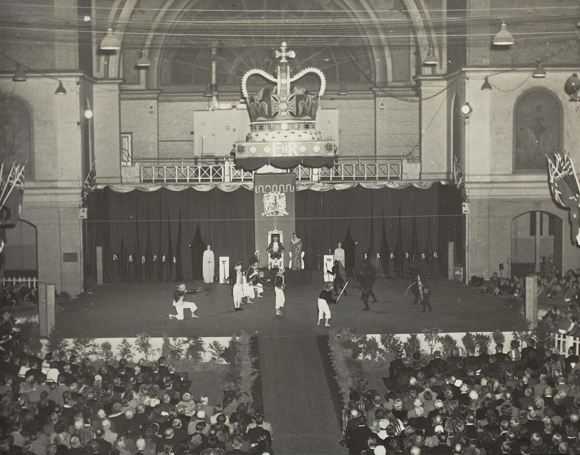 Performance in the Royal Exhibition Building with a giant crown above stage and the audience in foreground. This photograph forms part of the celebrations for the coronation of Queen Elizabeth II at the Royal Exhibition Building, Carlton, in 1953. Soldiers with muskets and 19th century uniforms fight Aborigines with spears and shields in front of a figure on a throne.