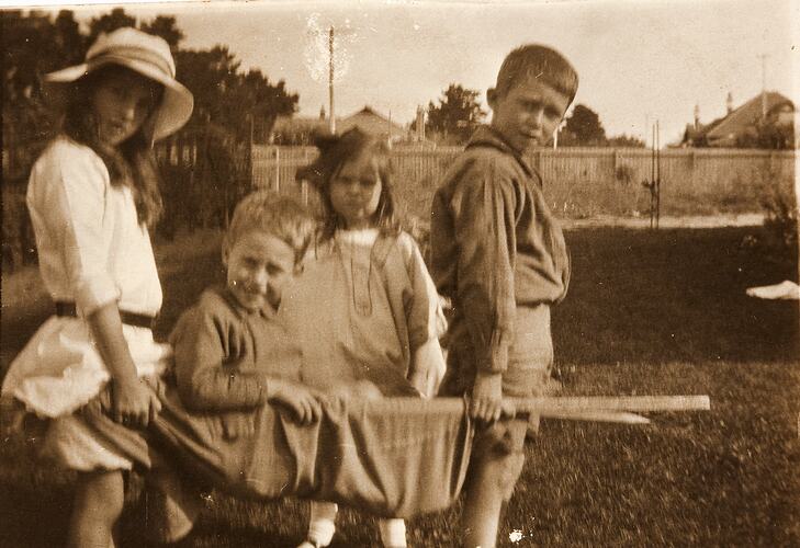 Photograph showing children playing 'Wounded soldiers' in the backyard of the Eyers home in Salford Avenue in Balwyn, about 1917. They were very familiar with the events of World War 1. Fred (aged 4), is playing with his sister Dorothy (possibly aged 8), a young visitor (most likely Joan Hyland), and brother Ernest (aged 7).