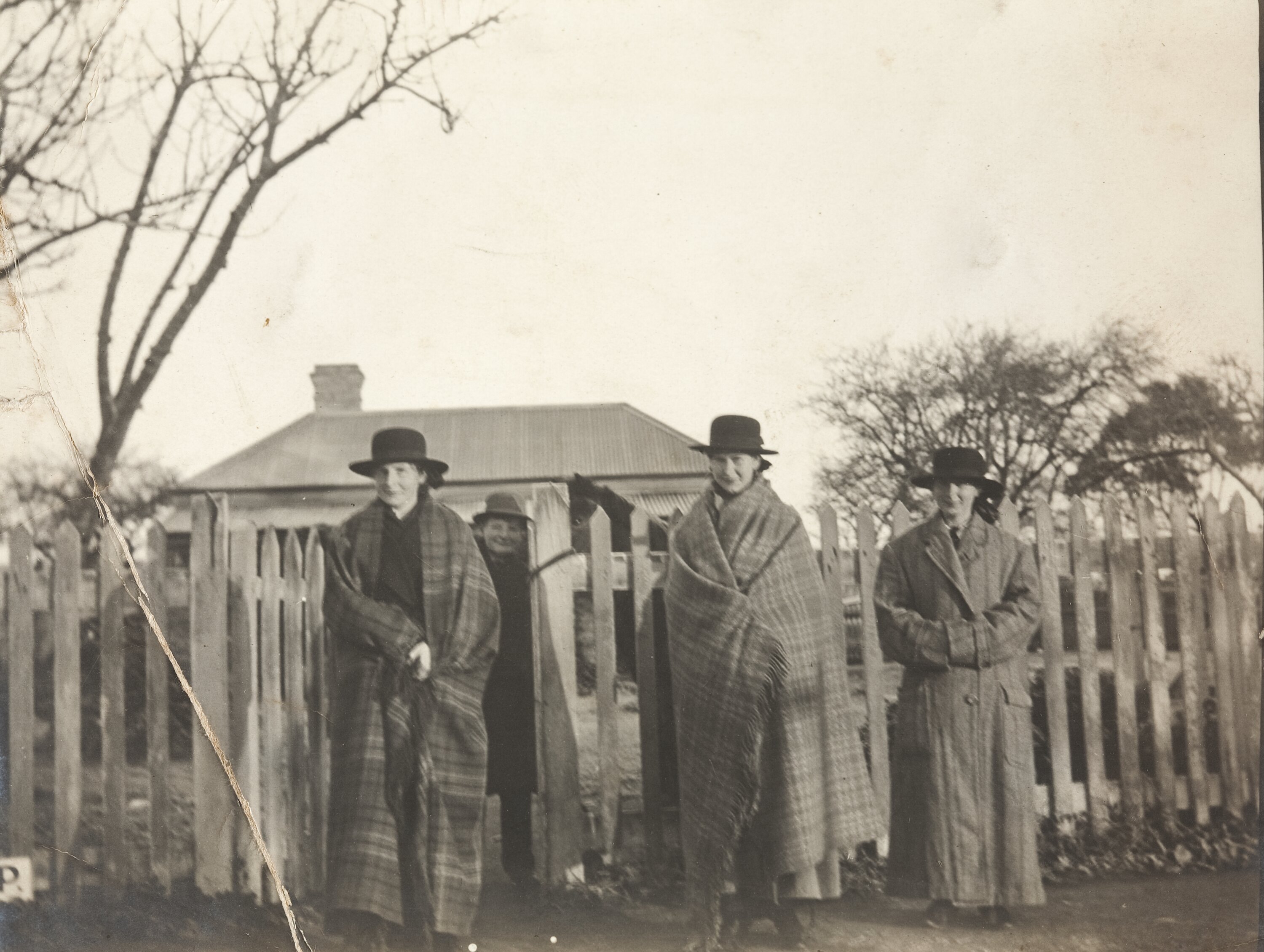 Three girls and boy wrapped in rugs and wearing hats, standing outside picket fence and farm house, Saint Margaret Island, about 1910.