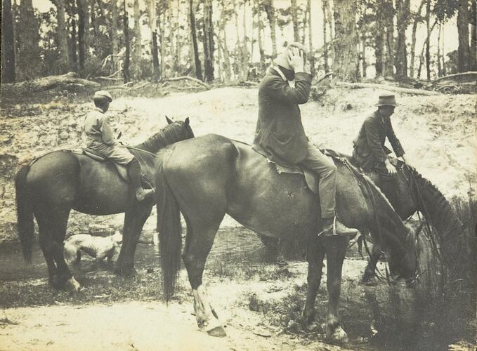 This image was taken on St. Margaret Island in Gippsland. Here some of the men in the O'Connor family are watering the horses somewhere on the island.