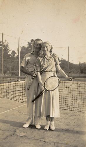 Man and woman in tennis uniform with racquets at tennis court. This photograph shows Madge and Lou Colegrave at Grace Park Tennis Club, Hawthorn, circa 1930s. This couple regularly played tennis at Grace Park. They played doubles and were entrenched in the social life of the club.