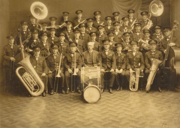 Black and white photograph showing a group portrait of the Anzac military band, in about 1920, post World War I.