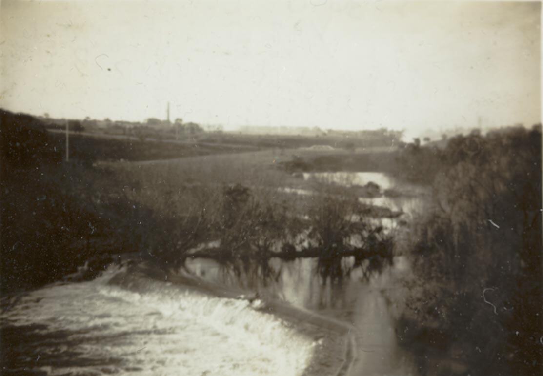 River with man made weir and low water falls, 1940s. The contributor's family lived at Roseneath Street in Clifton Hill which ran down to the Merri Creek. The family would often walk along the creek. This is most likely a view of Dights Falls on the Yarra River, Abbotsford.
