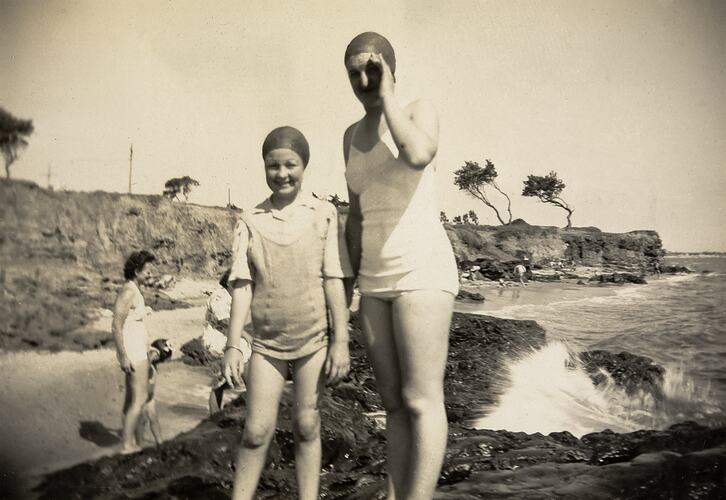 Woman and girl in swimming costumes and bathing caps, standing on rocks at beach. There is a cliff behind them. This photograph shows Joan Roberts and her daughter Debra at Parkdale Beach, Christmas, 1947. Joan may have been visiting friends and family at Christmas time.