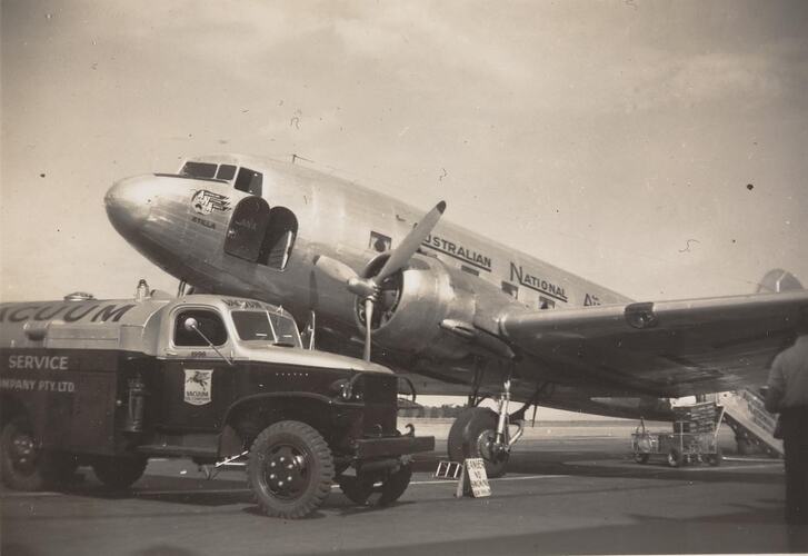 Airplane on tarmac being refuelled by a GMC fuel truck at airport. This photograph shows Essendon Airport, with an Australian National Airways (ANA) DC3 aircraft 'Kyilla' being refuelled in December 1948. Betty Watkins was going on holiday to Tasmania, and this was the plane she would be travelling on. She went with her fiance Len and a couple of friends.