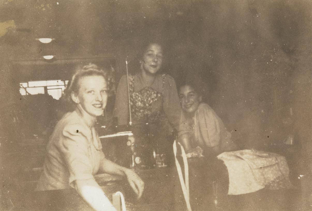 Three women sitting around two industrial sewing machines in a clothing factory. Nola Quaife took this photograph in about 1939, of her friends who worked together. They were working at the Smart Child Clothing factory, Camberwell, opposite Camberwell Civic Centre.