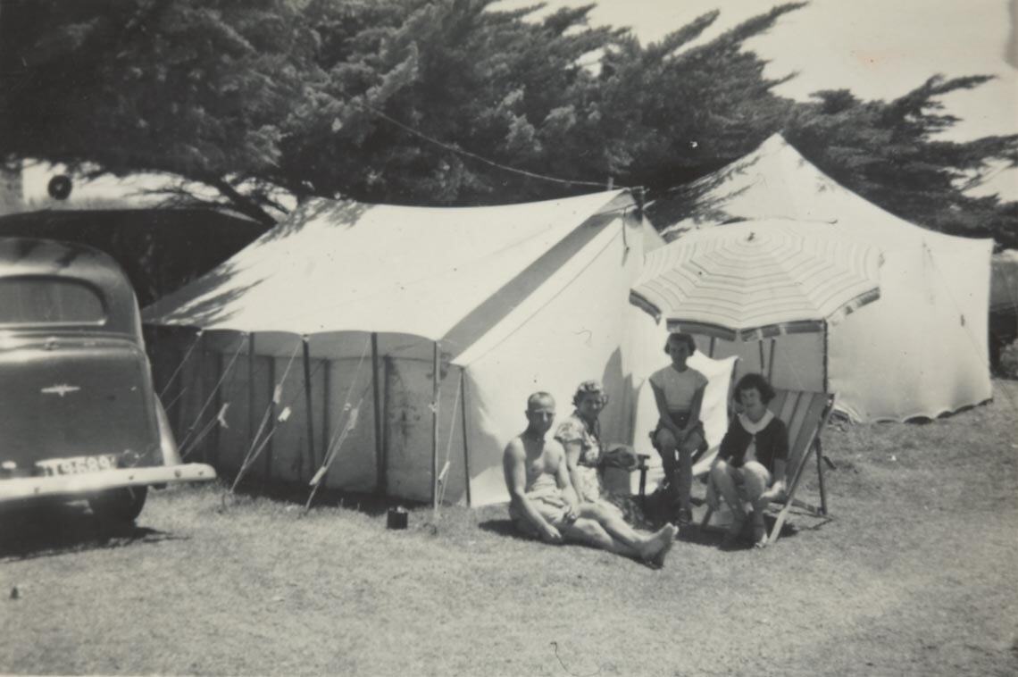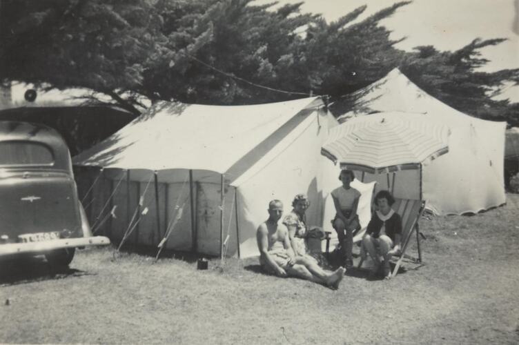 Family group sitting under beach umbrella in front of a tent. There is a car to the left hand side. This photograph shows the Sheldon family and Gloria Lancaster, Arthur Sheldon's fiancee, camping at Mornington, 1954. Gloria remembers that this was not a special camping ground, just 'a spot under the trees a bit inland away from the beach'. The family usually went away for Christmas, sometimes Port Fairy, sometimes Mornington and other places. Arthur's sister and brother in law, the Condicks, had a large trailer that they used to transport most of the camping gear. Three people slept in a tent. Gloria slept in the Vauxhall family car in a collapsible back seat. 'Grandma' Sheldon cooked over an open wooden fire.