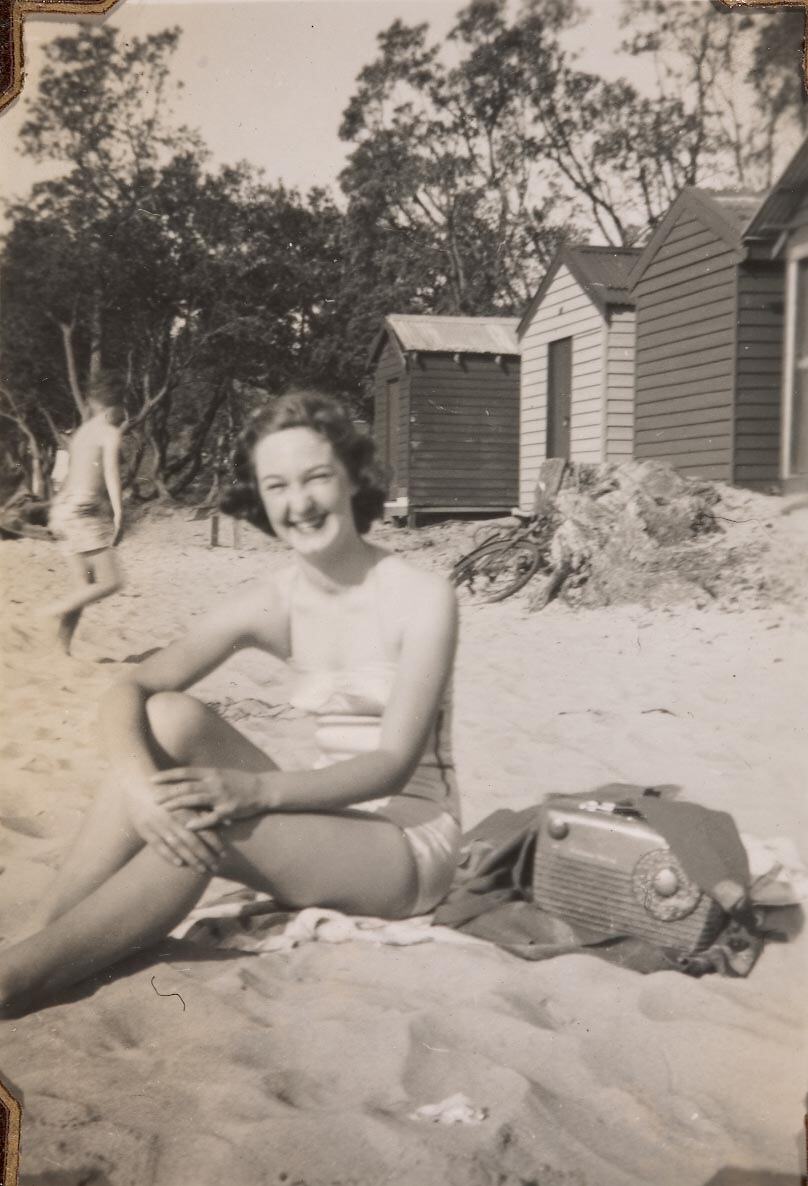 Woman in swimming costume, sitting on towel, next to portable radio on the beach. There are bathing boxes and a boy behind her. This photograph shows Gloria Sheldon and her radio at the beach, 1953. Gloria's mother was furious that she bought this radio, because it was so expensive. It was a battery and power point combination, and Gloria remembers that was 'almost unheard of'. She liked to listen to pop music on it, and usually took it to the beach. It was 'the thing to have'. The photograph was taken at Mornington, and the bathing boxes behind her don't exist now.