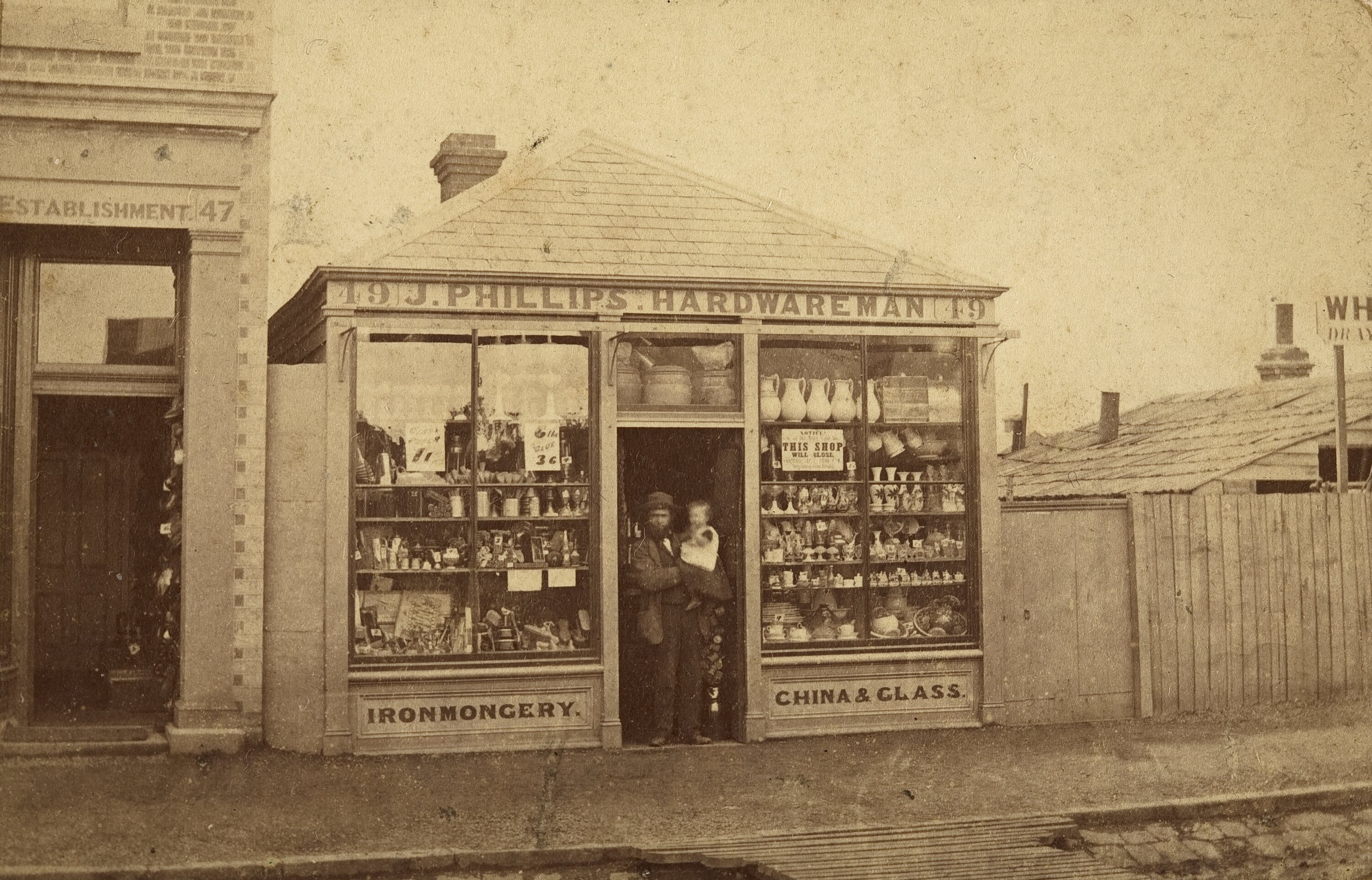 Sepia photograph featuring James Phillips in the doorway of his store 'J. Phillips Hardwareman', at 49 Victoria Street Abbotsford between about 1865 and 1870. He is holding one of his daughters (either Mary, born 1862, Amelia, born 1866 or Milly, born 1868). It is likely that the photograph was taken when the business first opened to mark the occasion, so may be closer to 1865.