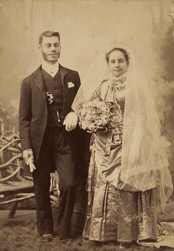 Studio portrait of man in suit with side-whiskers, and woman in wedding gown and veil, holding flowers. He is carrying his glove in his right hand. There is a rustic wooden seat to the left. This is a studio portrait of Joseph Solomon and Mary Phillips on their wedding day in Richmond, 1886. The wedding took place at Mary's family home at 51 Simpson Road [Victoria Street], Collingwood. Her great grand daughter still has the skirt of Mary's wedding outfit.