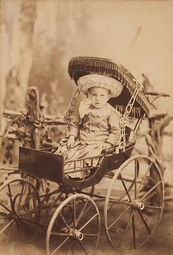 Studio portrait of Maximillian Landman in 1887, aged 18 months - 2 years old, and photographed in his Sunday best, sitting in a perambulator at the studio of Yeoman and Co. After successfully completing his schooling at Camberwell State School, he later went on to become a pharmaceutical chemist.