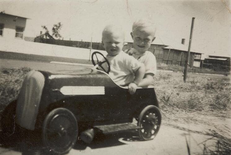 Two little boys squeezed into a toy car, riding it on a foot path. This photograph shows David and Martin Nowell in their toy car, December 1952. Their mother Melva Nowell bought this toy car for the boys for Christmas. It was second hand, and their father Jack Nowell gave it a new coat of red paint before giving it to the boys. It didn't fit under the tree so they had to go outside to get their surprise. The children used to always their parents 'why the other children had such flash bikes and cars' when they didn't. Melva and Jack told them it was 'because they (Melva and Jack) didn't have enough money to give Santa'.