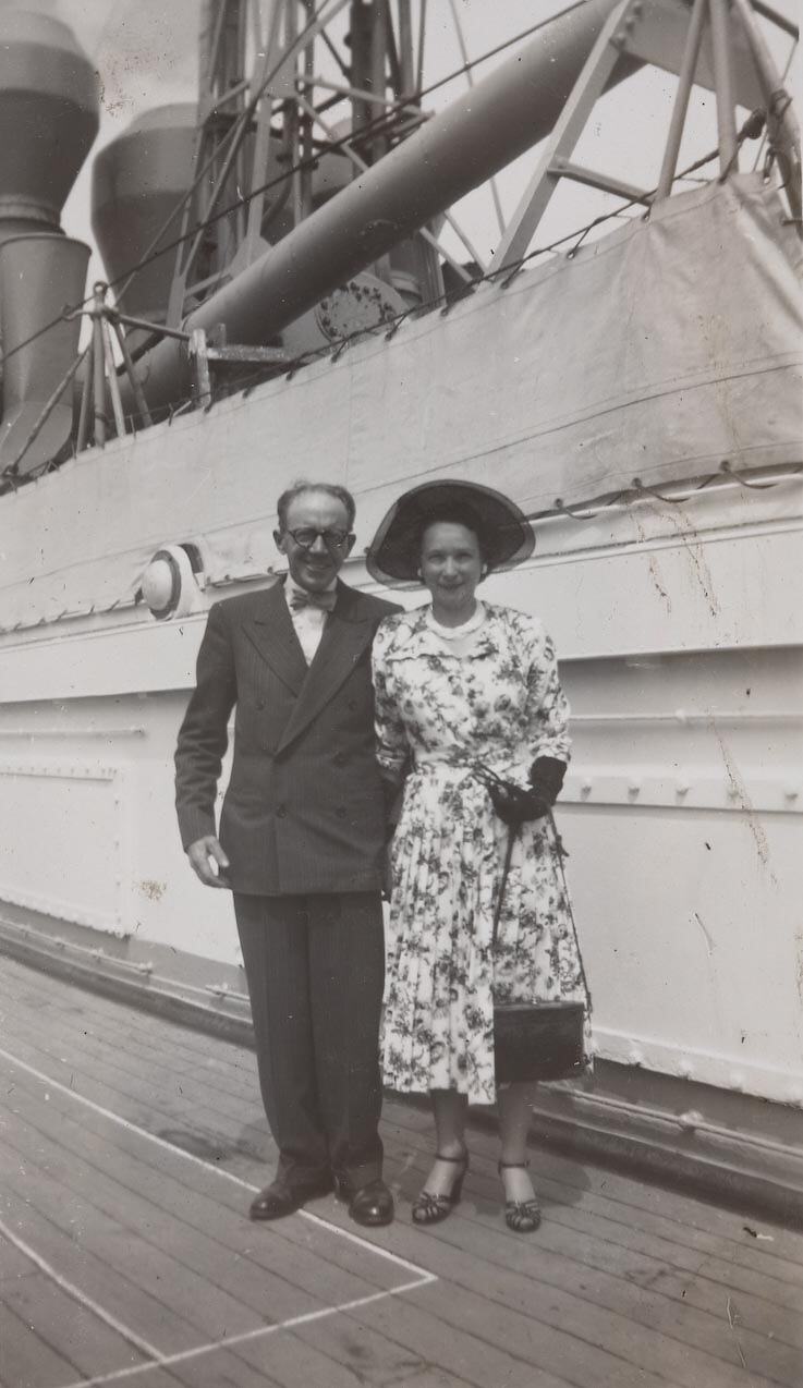 Photograph of Mr Harry and Mrs Jenny McCrea on board the 'SS Orontes', 1952. The photographer David Meale went as a teenager with his aunt and uncle to farewell Mr McCrea, a family friend, who was leaving Australia on a business trip. David remembers: 'His wife wasn't going. Mr McCrea and his brother Hugh had their own import business 'H & H McCrea'. They represented manufacturers, mainly women's clothing and accessories made in England and Scotland. They would go to places like Myers and Buckleys with samples, get the buyers to make orders and receive commissions from the manufacturer. After working for 10 or 15 years, Harry was going overseas to visit their business principals for the first time. While he was at sea, Prime Minister Menzies responded to a 'financial crisis' and heavily restricted imports. This meant they couldn't import the things he had gone to sell, and the trip was a total waste of time and money. They conducted their business otherwise by mail.'
