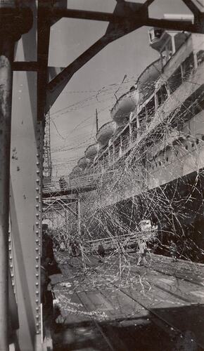 View from pier of masses of streamers breaking and trailing from a departing ship. This photograph shows the departure of the 'MV Orontes' from Station Pier, 1952. This vertical view complements image MM110508. When the 'Orontes' departed, the photographer's family farewelled their friend Mr Harry McCrea with streamers from Station Pier. Traditionally, the person on board the ship would throw a roll of streamers overboard to the people below. As the ship moved away from the pier, both sides would hold on to the streamers for as long as they could until they broke.