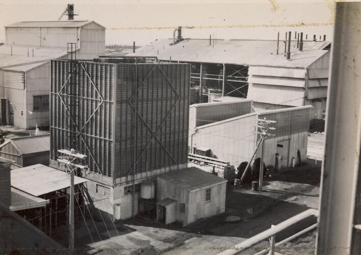 View from above of a rectangular cooling tower, boiler house and Phenol plant. This photograph shows a view from the Formalin plant, to the cooling tower, boiler house and Phenol plant, at Monsanto Chemicals, West Footscray, in 1954. The photographer, David Meale was a trainee chemist. He would work at Monsanto during the day and go to Melbourne Technical College to study at night.