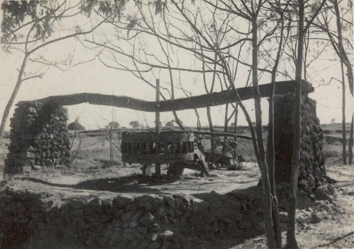 An enormous wooden wheel, sitting horizontally, with a vertical spoke through the centre, into the ground. There is a stone wall around the perimeter. This photograph shows a gold battery in Queenstown, now Smith's Gully, in the 1930s. The gold battery was used in the early 1900s by locals mining for gold.