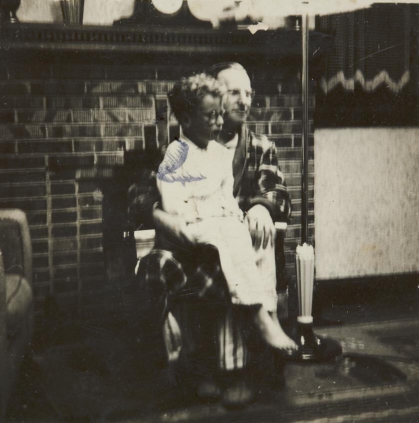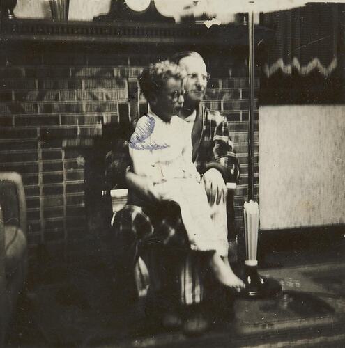 Father sitting in chair with young son on his knee, in the lounge room. Both are wearing glasses and pyjamas, and the father is also wearing a dressing gown. This photograph shows Clement Garrison Charman Moore holding his young son Ronald Moore, in the lounge room of their family home, Canterbury Street, Flemington, 1946. According to the family, Clement Moore was named after Lord Charman and Lord Garrison. Clement Garrison was born in 1905 in Wimbledon, Surrey.
