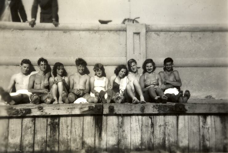 Four girls and five boys sitting on wooden pier, with a concrete retaining wall behind them. They are all in swimming costumes. On the left, one boy has his arm around the next one's shoulder. This photograph shows Ted Lhuede and a group of Port Melbourne friends sitting together just east of Station Pier in 1950. They were sitting near the London Hotel, and near where Swallow and Ariel Biscuit Factory used to be. Ted Lhuede is on the far right. He was fifteen or sixteen years old.