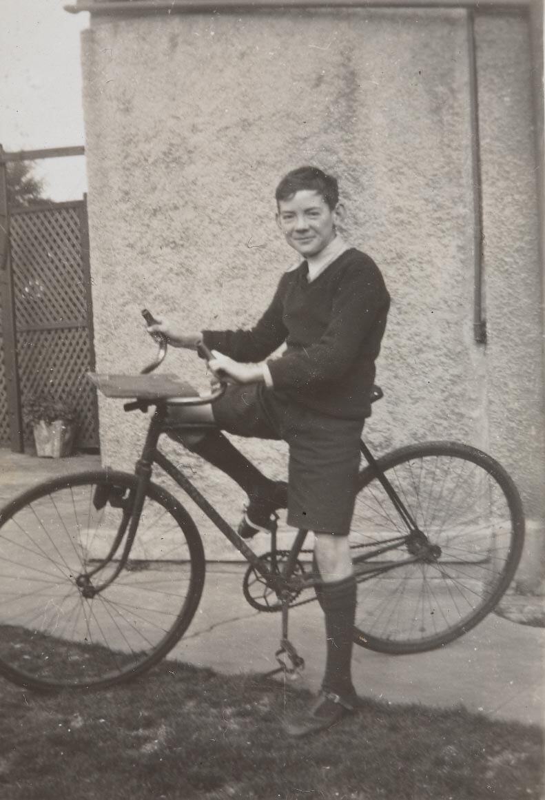 An adolescent boy in school uniform on his bicycle. There is a wooden seat on the handle-bars. This photograph shows Ted Lhuede, aged about 12 on his bicycle, in his school uniform, 1946. There is a wooden seat that he has attached to the handle bars, for a passenger to 'double dink'. The photograph was taken at his family home in Port Melbourne.