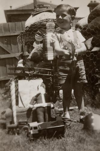 Boy standing next to toy Santa and toys. There is chicken wire and sand-bags behind him. This photograph shows Kevin Greenhatch 'showing off' his Christmas presents in the backyard of his family home in Arkle Street Prahran, December 1942. The photograph was taken in front of sandbags used for air raid shelters during World War II.