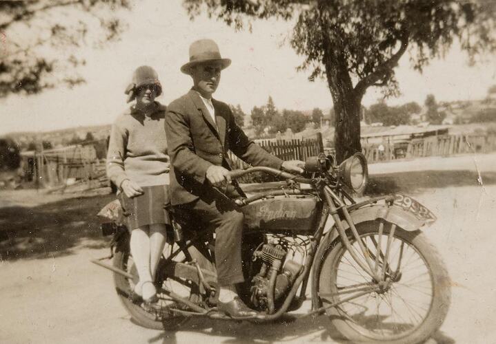 A man on an Indian motor bike in hat and suit with a woman sitting behind him, 'side saddle', wearing skirt and cloche hat. This photograph shows Ada Jewel and Jim Martins on their Indian motor bike, 1926. Jim would come down every weekend from Bendigo to visit Ada until they married in 1928. His family remembers that 'He always said the road through the Black Forest was just paved with felled logs to counter the mud, which made it a very bumpy trip.'