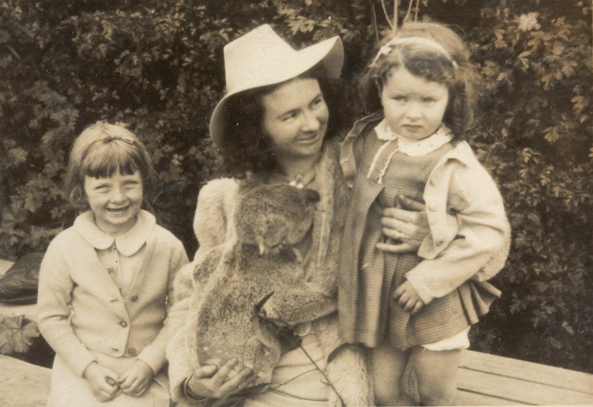 A woman and two girls, sitting down. The woman is holding a koala and wearing a sun-hat. This photograph shows Lilian D'Elton and her daughters, Yvonne and Valerie, holding a koala at the Balwyn Wildlife Sanctuary, 1943.