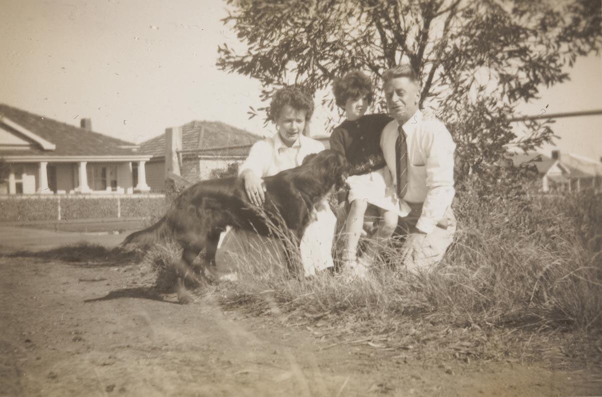 A man and two girls kneeling with dog in a playground. Bruce D'Elton with his daughters Yvonne and Cynthia and their pet dog in a playground in Footscray, 1952. After her parents separated Yvonne D'Elton's father would visit every second weekend. They would go to 'the most wonderful places', like the Museum.