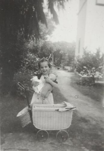A girl carrying her dolls with a pram on side path in back yard. This photograph shows Judy Schlesinger with her dolls, and her baby brother's pram, in her family backyard, Kew, March 1953. She was four and a half years old.