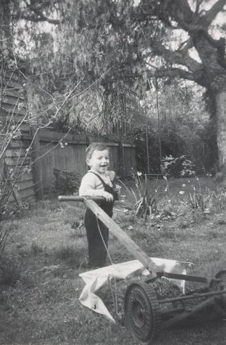 A small boy in overalls, grinning at the photographer, and trying to push a manual lawnmower in a backyard. This photograph shows Peter Schlesinger 'helping Dad mow the lawn' with the old manual lawn mower in August 1954 in Kew. His sister Judy remembers 'Like most little boys, he loved to help.'