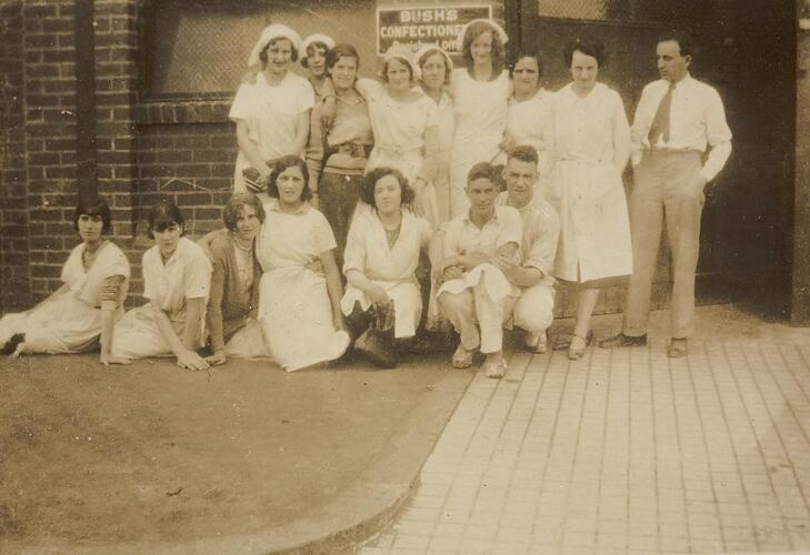 Black and white photograph featuring thirteen female and two male staff, and Mr Ribush, one of the owners, at far right in a shirt and tie, outside Bush's Confectionary Factory, at 127 Murphy Street in Richmond, circa 1935.