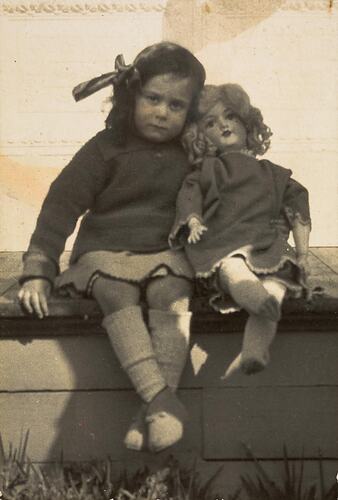 Digital Image of Rosa Baitz with a china doll on the verandah of her family home, Essendon, 1925. The photograph was taken on her 3rd birthday. Both Rosa's and the doll's dresses were homemade, and had crocheted edging by Rosa's mother. Rosa's felt footwear was made by Rosa's father, Elias Baitz, who was a slipper manufacturer.
