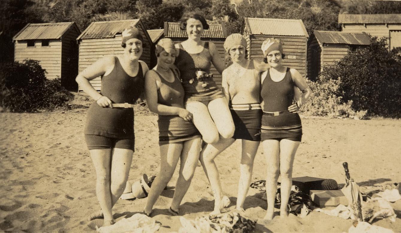 Five women at the beach in swimming costumes. One is being lifted up by two of the others. There is a row of bathing boxes behind them. This photograph shows Esme and Emily Stockley and their friends on the beach, circa 1930. Emily Stockley, on the far right, is playing at the beach with her girlfriends, possibly before she married. The location is unknown.