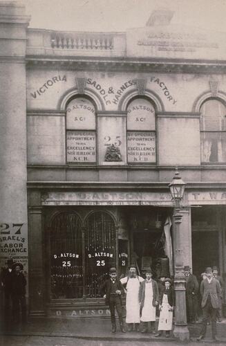 Staff photograph of D Altson Victoria Saddle and Harness Factory. This photograph shows the staff and owner of D Altson Victoria Saddle and Harness Factory, Melbourne circa 1880. According to the family, 'the factory provided the equipment for Bourke and Will's expedition.' The owner, David Altson is second from the left with a big beard and apron. He came to Australia circa 1852 from Yorkshire.